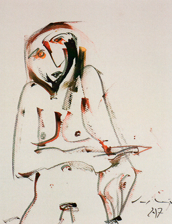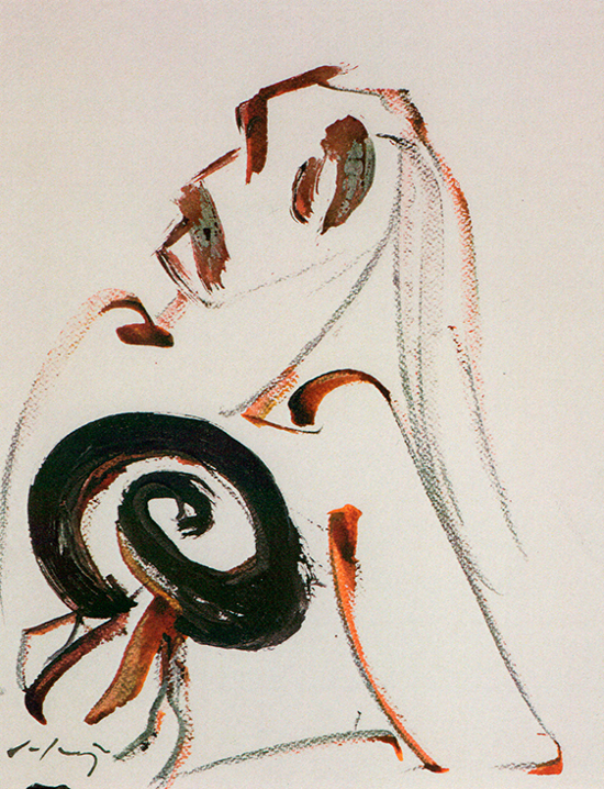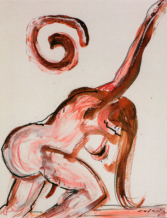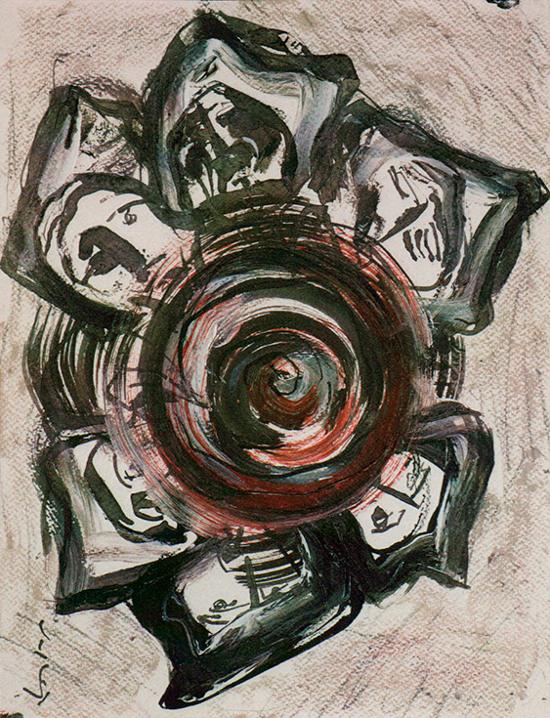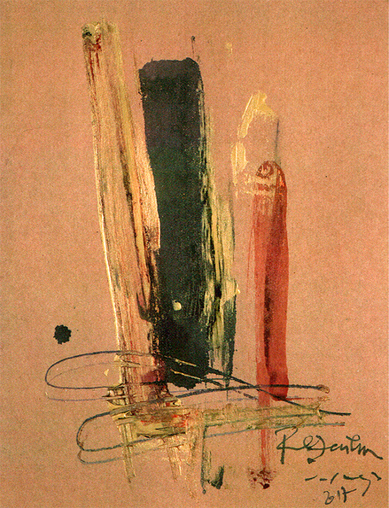 Las viejas espirales retocadas en las paredes del monasterio alumbraron otras nuevas en una traslación de enorme fuerza plástica. El resultado no es apto para pusilánimes. Monjes vortiformes que liberan sus almas atrapadas sobre la escalera de Cardeña en los nuevos y cetrinos lienzos dispuestos en el CAB; tormentosas creaciones que refieren sin tapujos deseos ocultos, que se revuelven contra las privaciones, que gritan reclamos de vida cierta, espoleados frente a las ausencias, insatisfechas ante la penuria y la parquedad.